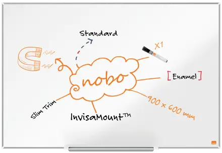 Emaljeret magnetisk whiteboard med tidssvarende smal og diskret ramme, der giver en mere tilgængelig og optimal skriveoverflade. InvisaMount™ systemet gør installationen nem, og monteringen er pænt skjult bag tavlen. En stilfuld whiteboard pennebakke til opbevaring af whiteboard markere og tavleviskere er medleveret. Den emaljerede magnetiske whiteboardoverflade giver en uovertruffen slet- og holdbarhed ved hyppig brug. Størrelse 90x60cm.