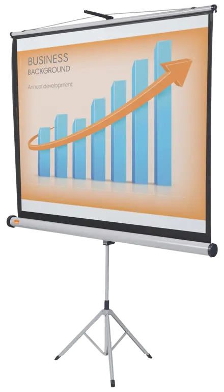 Écran de projection à trépied flexible. Sa surface blanc mat lumineuse à bordure noire fournit une image nette et détaillée, facilement visible par toute une salle. L'écran se rétracte aisément dans son carter pour le protéger de tout dommage. 1 500 x 1 138 mm.